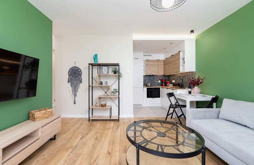 This modern and cozy apartment has the ability to accommodate up to 4 people. The space of the apartment offers a living area, which includes a small balcony, a fully equipped kitchenette, a stylish bedroom and a bathroom with a shower. The tastefully finished living room with a sofa bed and Tv is a perfect place for rest and relaxation. Modern design and comprehensive equipment with necessary kitchen and bathroom accessories guarantee a comfortable stay. Guests can take advantage of a welcome set of toiletries (soap, shampoo and shower gel), towels, linens and a wide range of household goods. The apartment is distinguished by its sophisticated design and functionality. The choice of interior colors emphasize the high standard of the apartment and provide a unique atmosphere.