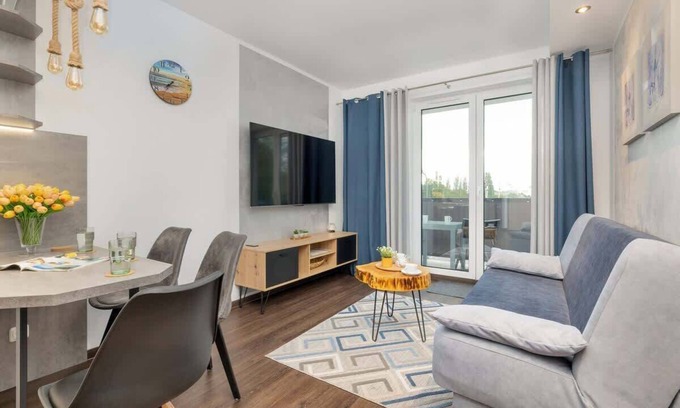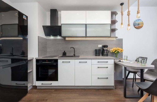 This stylish apartment can accommodate 3 people - ideal for a seaside stay with family or friends! The accommodation consists of a living room with kitchenette, bedroom and bathroom with shower. The interior is bright, spacious, functionally designed and tastefully finished, meeting all the needs of guests. The living area, equipped with a comfortable sofa and a flat-screen Tv, is the perfect place to relax and unwind. The apartment has access to free high-speed Wifi internet and a SmartTV. The bedroom offers a very comfortable double bed and a spacious wardrobe. There is also a balcony with garden furniture - the perfect place to sip your morning coffee or relax after a busy day. In addition, the kitchenette is equipped with high-quality household appliances, which will allow you to prepare your favourite meals. The many amenities and comprehensive furnishing of the apartment with the necessary kitchen and bathroom accessories and equipment guarantee a comfortable stay. The apartment is ideal for any type of holiday, especially if you value comfort and beautiful design. Complimentary toiletries, towels and bed linen are provided to facilitate the start of each night's stay. The apartment also comes with a parking space in the garage hall, which is an advantage, especially during the holiday season.