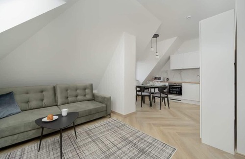 The functionally furnished flat can accommodate 4 people. It consists of a spacious living room, a bedroom with a double bed, a stylish kitchenette and a bathroom with a shower. The flat is distinguished by an aesthetically decorated interior with attention to detail. The living room has a sofa bed and a flat-screen Tv, the bedroom is equipped with a comfortable double bed. The kitchen is equipped with all Rtv and household appliances such as dishwasher, oven, induction cooker, microwave and all necessary kitchen utensils including dishes, glasses and pots. Amenities such as a hairdryer and iron are also available in the flat.