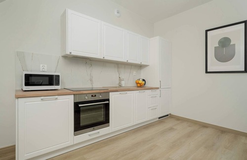 Functionally furnished flat can accommodate 4 people. It consists of a spacious living room, a bedroom with a double bed, a stylish kitchenette and a bathroom with a shower. The flat is distinguished by an aesthetically decorated interior with attention to detail. The living room has a sofa bed and a flat-screen TV, the bedroom is equipped with a comfortable double bed. The kitchen is equipped with all RTV and household appliances such as dishwasher, oven, induction cooker, microwave and all necessary kitchen utensils including dishes, glasses and pots. Amenities such as a hairdryer and iron are also available in the flat.