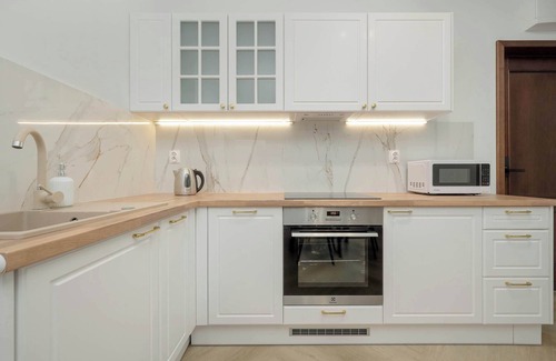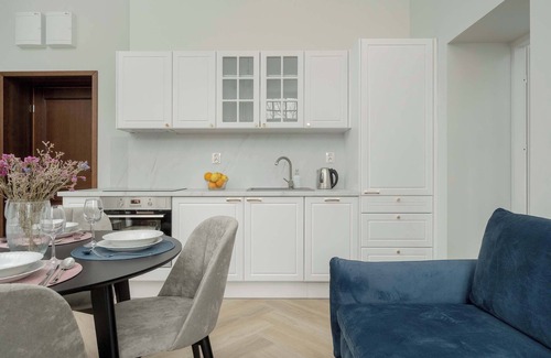 Functionally furnished flat can accommodate 4 people. It consists of a spacious living room, a bedroom with a double bed, a stylish kitchenette and a bathroom with a shower. The flat is distinguished by an aesthetically decorated interior with attention to detail. The living room has a sofa bed and a flat-screen TV, the bedroom is equipped with a comfortable double bed. The kitchen is equipped with all RTV and household appliances such as dishwasher, oven, induction cooker, microwave and all necessary kitchen utensils including dishes, glasses and pots. Amenities such as a hairdryer and iron are also available in the flat.
