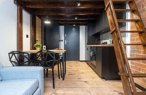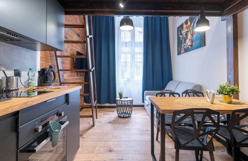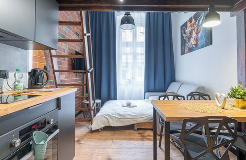 Żwirki i Wigury Apartment #1 is a cozy and practical apartment that features a living room with a sofa bed and a kitchenette, a mezzanine with a comfortable mattress, and a bathroom. Guests have various amenities at their disposal, including free WiFi, a TV, an iron, a hairdryer, a dishwasher, an oven, a fridge with a freezer, an induction cooker, and kitchen accessories.