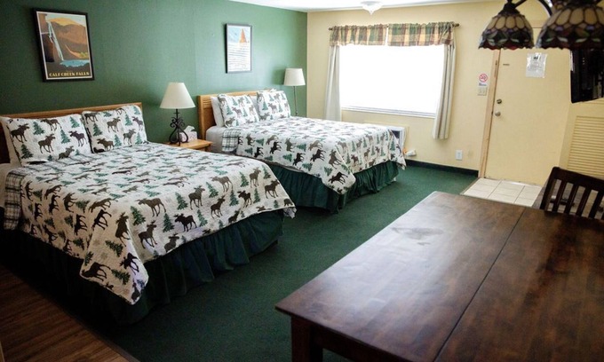 2 Queen Beds -1 Bath-Large Dresser-Flat Screen TV with Satellite-Kitchenette: Microwave-Coffee Maker -Bar Sink-Small Fridge-Counter-Table-Chairs