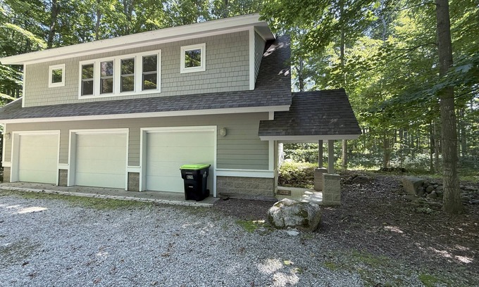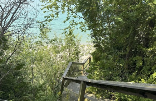 Nestled in the woods just north of the sights, sounds, shops and restaurants of historic Leland and Fishtown, sits this restful one bedroom one bath apartment. This is the perfect "get back to nature" property. The bedroom has a queen bed and an amazing shower in the bathroom. A washer and dryer are at your disposal. The beautiful shoreline of Lake Michigan is accessible from a shared walkway to the 91 steps that invite you to the waterfront where you can walk hand in hand as far as the eyes can see and begin the hunt for the ever popular Petoskey stones. The sunsets are breathtaking and will leave you wanting more! This charming apartment has a fully stocked kitchen, smart TVs and a gas fireplace for those cozy evenings. There is also a firepit if you want to set and look at the stars and listen to the sound of the waves on Lake Michigan, you might even see some of the wildlife such as the white tail deer. Come and enjoy this peaceful little slice of heaven.