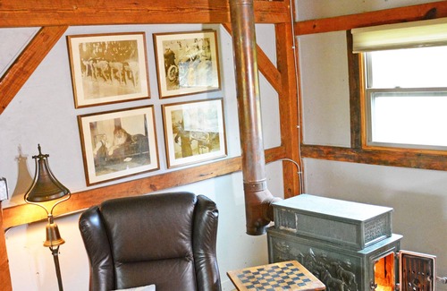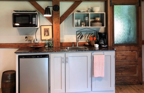 Once a timber-framed workshop, this recently renovated retreat now feels like a luxury suite, complete with a spacious bathroom, blissful bed, and a toasty wood stove.