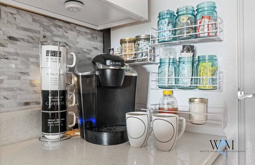 The spacious bedroom features a luxurious king-sized bed with comfy linens for a restful night’s sleep. The living room offers both a sleeper sofa and a futon, making it ideal for small families or a group of friends. The fully equipped kitchen has everything you need to whip up meals, and the clean, well-appointed bathroom comes with fresh towels and complimentary toiletries.