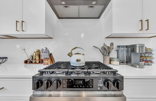 Inside, you'll discover a beautifully crafted townhome by a renowned local builder. The ground floor features the main entrance and a two-car garage. Ascend to the main floor, where you'll find an open-concept living space that includes an eat-in kitchen, dining area, and living room, as well as a bedroom with a queen bed and a full bathroom. A sliding door leads to the back deck, offering outdoor seating and a grill area.