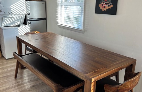 L shaped indoor bar for entertaining, a large dining room table inside, and a 8 person dining room table outdoor as well!