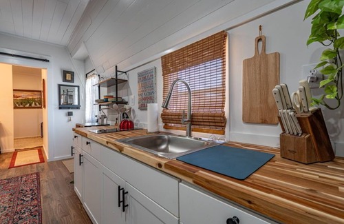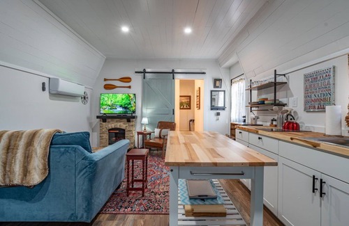 Tiny home that feels big! 1 bedrm and 1 bath, perfect for a quiet get away. Cooktop and full refrigerator in kitchen. Walk-in tiled shower. Zero step entry. Watch the beautiful sunsets over the mountain and enjoy an evening fire outback. Easy stroll to all the restaurants, breweries, coffee, shops, and stores into through the public park. The park features a slide, basketball, courts, tennis, playground, and a trickling stream. 2 miles to the winery, golf and 25 mins to Boone. Onsite parking.