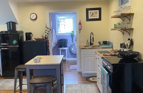 There are stairs leading up to the apartment, so guests must be comfortable and able to climb. The apartment has a studio feel, but does have a separate bedroom for privacy. There is a queen bed in the bedroom, and a futon in the living room. Wifi allows for Amazon and Apple tv streaming. The kitchen space is small, but well equipped for most needs, including an oven. The bathroom has a shower and a washer/dryer unit. The unit is cooled/heated by a heat pump, so there is air conditioning available in the warmer months.