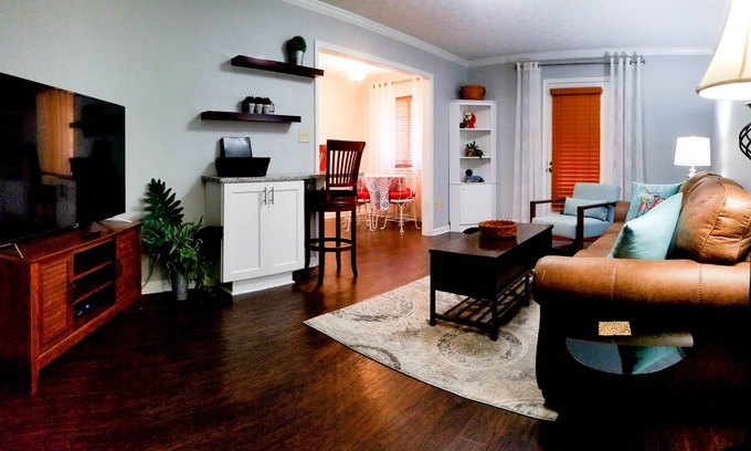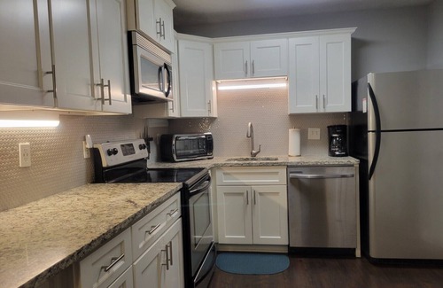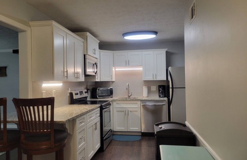Recently renovated 1 BR/1BA condo located within 10-15 minute walk to Sanford Stadium and very close to campus and downtown Athens. Off street parking (very unusual for being this close to campus). Spacious, clean and quiet, with our unit 100% available to you during your stay. Includes fully-equipped modern kitchen and new bathroom with walk-in shower. Sleeps four with king bed in spacious bedroom and queen sleeper sofa in living room. Includes fast wireless internet and large flat screen television in living room with free streaming tv services (including YouTube TV and Netflix). Also available during your stay is a stackable washer/dryer. First floor condo has back porch overlooking secluded grass lawn area - very quiet, but still close to everything Athens!