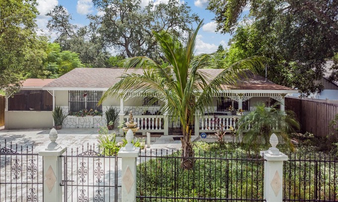 Caribbean style estate is large and designed for family & friends to enjoy and relax in while vacationing in the Tampa / Clearwater / St Pete community. Located across the street from Busch Garden's Adventure Island water park. You can walk to either park in minutes! This charming home has been completed remodeled, most everything is new from the roof to the hardwood floors. The furniture selection and floor plan design have all been well-thought-out to provide maximum relaxation. There are two master bedrooms, one of which has a full bath. Bathrooms are completely new and beautiful. Two bathrooms are important when gatherings are large. Home features a huge entertainment area surrounding the well-appointed kitchen. There are 3 flat-screen TVs; 50', & two 30' with soundbars. Cable TV and high-speed internet, Wi-Fi. There are 2 patios and a front porch with rocking chairs! Backyard is filled with tropical fruit trees; papaya, avocado, oranges, grapefruit, tangerines, 4 mango trees. All fenced in to give you seclusion and peace.