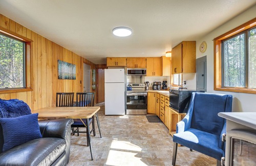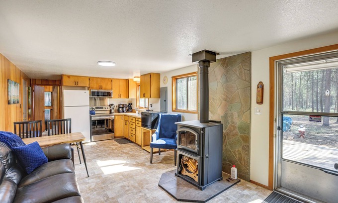 Delight in the rustic charm of this 2-bedroom, 1-bathroom vacation rental cabin in beautiful La Pine, Oregon! Perfect for a rejuvenating retreat, this serene abode features a wood-burning stove, a full kitchen for preparing homemade meals, and a private deck and fire pit to enjoy the views. When you're ready to explore, hit the slopes of Mt. Bachelor, fish in the Deschutes River, or take a day trip to Downtown Bend!