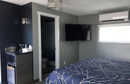This Suite features a queen bed, full bath, hair dryer, iron, WiFi, Netflix & YouTube TV on a 49” screen. Checking in is a breeze with keypads.