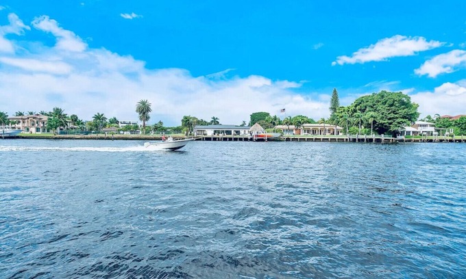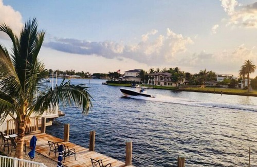 A true tropical paradise! This beautiful wide-waterfront property is adorned with calming palm trees, flowering plants, and a gorgeous pool. The nautical themed apartment is fully stocked with everything you need to feel at home. Free use of a beach cart, umbrella, and beach chairs. A long list of restaurants and bars are a short walk away. 5-7 minute walk to our beautiful Pompano Beach. Relax, chill, and refresh at this unique and tranquil tropical getaway. No one ever wants to leave.