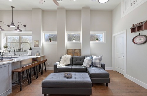 A Tri-level home that sits on a 10 acre property fully fenced. You can see downtown Austin from both decks. The views are serene and a 1 acre pond sits 200 yards in full view. with a children's playscape, a fire pit to enjoy an evening outside with friends and family. The gazebo is equipped with a gas grill next to the playscape so you can keep an eye on your children as you cook your favorite meals. The numerous oak trees surround the property but has a large clearing of lush grass in front of the house to enjoy. The house has 2 kitchens upstairs and downstairs with a TV in almost every room along with highspeed internet.