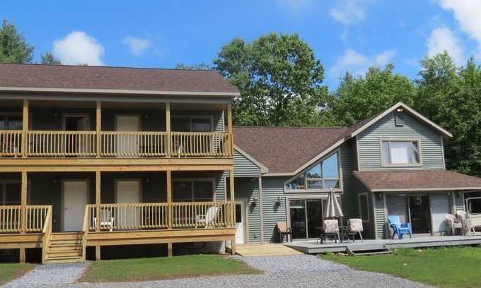 Winding driveway leads to the beautiful property overlooking the water across Route 9N with water rights for boating, fishing and swimming. We have a private dock that is shared by our three houses and there is a nice sandy beach around one mile away. Additional seven bedroom and/or five bedroom house can be rented together if you need more room. The 3 houses can be rented together to give you a total of 22 bedrooms.