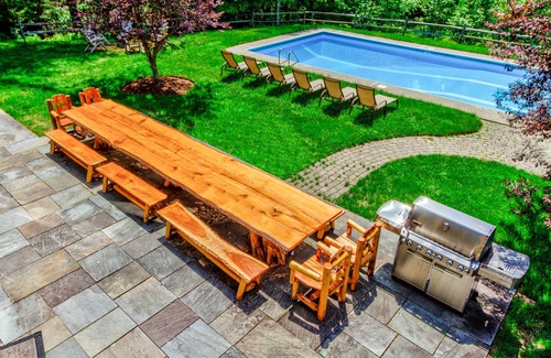Outside is the swimming pool, which is heated from late June to early September, and a hot tub which is available year-round and is serviced professionally every week. There is also a top-of-the-line huge gas barbeque and a smaller gas grill, plenty of furniture, and a fire pit. Two kayaks are also available for your group.