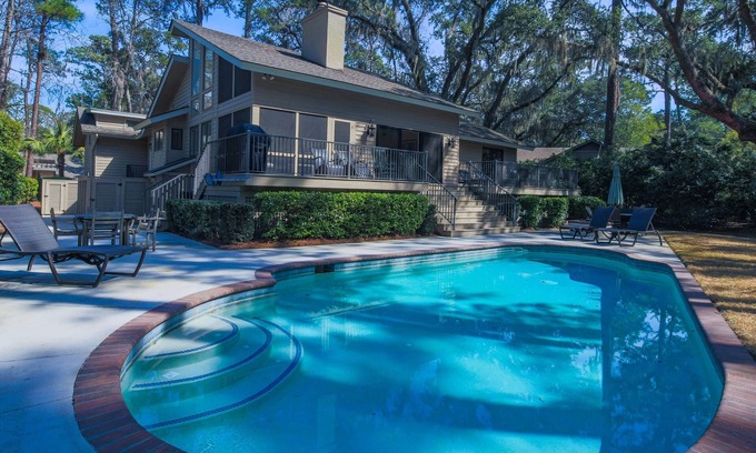 Love the beach but want privacy & serenity too and a private pool for your kids to splash & play? Welcome to Sailors Cove, which is a family-friendly, beautifully renovated home that is a short, 10 minute walk to the beach. Your kids will LOVE this home, with its bunk room, private pool in the backyard and easy access to the fun activities within Sea Pines Resort. Sailors Cove is tucked away within the live oaks, sea pines, bamboo, palmetto trees and other maritime forest vegetation, providing a very private & well-screened backyard retreat. The well-stocked kitchen and multiple indoor & outdoor gathering areas make this home an excellent getaway for extended family or friends.