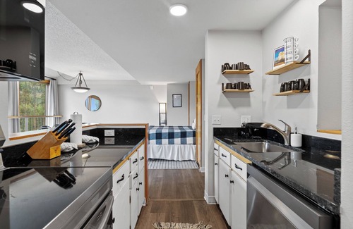 The full-sized kitchen is stocked with all the essential cookware and tableware to make a meal away from home and features modern stainless steel appliances. Adjacent to the living space, the dining area comfortably accommodates six guests. The full bathroom offers a spacious single-sink vanity, along with a shower and bathtub combination, complete with towels and initial toiletries. Settle into the recently upgraded queen-size bed tucked away in the far corner of the unit, promising a restful night's sleep. Though somewhat compact, this unit offers a cozy retreat to unwind and rest after a day of adventure, providing all the necessities and more for a comfortable stay.