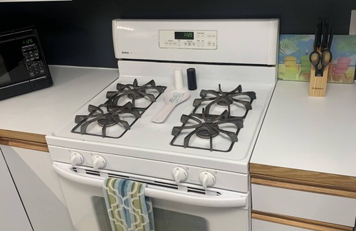 Full size eat in kitchen with plenty of cooking amenities. Croc pot, toaster, blender, air fryer, coffee maker and baking pans. No need to hand wash dishes, just use the dishwasher. Full size fridge to stock up.
