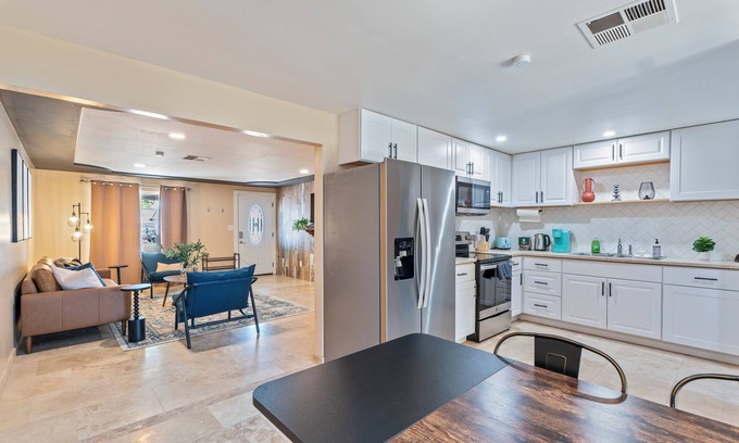 Welcome to a stylish 3-bedroom, 2-bathroom home blending rustic charm with modern amenities. Inside, enjoy a fully equipped kitchen, cozy living spaces with TV and WiFi, and comfortable bedrooms. Outside, relax in a spacious backyard with patio seating and a grill. Conveniently located with easy freeway access, you're just minutes from downtown Phoenix and the Glendale Entertainment District. Perfect for both relaxation and exploration, this home offers everything you need for a memorable stay. There are two units on the property, each with it's own private entrance. Backyard is shared. This unit has 3 bedrooms and 2 bathrooms.