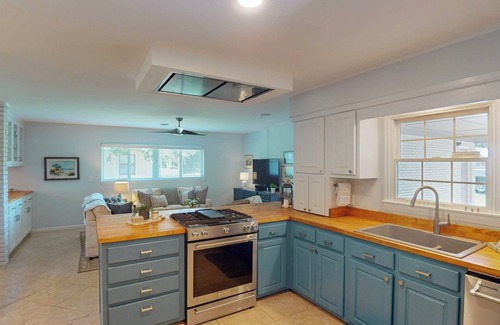 The kitchen is well-equipped, featuring a Kitchen-Aid gas range and large pantry for vacation supplies. Every queen bed is triple-sheeted for cleanliness with hotel-quality sheeting and the top cover changed for every guest. Twin bunks are also dressed with hotel-quality bed linens and a coverlet, all of which is freshly laundered for new guests.