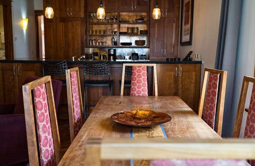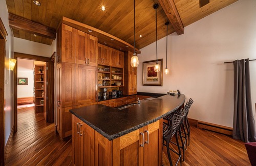 The beautifully done kitchen includes granite counter tops and comes fully stocked with all of your cooking needs. Additionally, there are 3 bar stools along the kitchen counter as well as a dining room table that comfortably fits 6. The living room is a perfectly cozy place to relax in front of the fire with the family after a long day on the mountain.