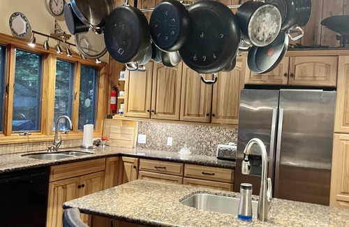 Enjoy expansive lake views from nearly every room. Beautiful vaulted wood ceilings, granite counters in the kitchen and all baths, wood stove and gas fireplace, outdoor fire pits, outdoor shower, hot tub, multiple decks, and ceiling fans in every room for summer comfort. Our well outfitted roomy kitchen is a cook's delight. Great room, 4 bedrooms, TV room/den with sleeper = 5 private sleeping spaces, plus 2 lofts (with 2 queen beds) and 4.5 baths . Outdoor shower is private and a delight. Decks overlooking the lake have multiple tables, lounges, BBQ and hot tub.