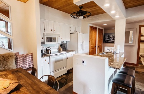 Totally updated condo. This one bedroom, one bath condo has new granite counter tops in the kitchen and bath along with new heated tile floors throughout. Relax on the quiet balcony with mountain views. Ski lifts are only 100 yards away or walk across the street and catch the free shuttle that will take you to the base area or to town.