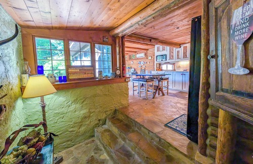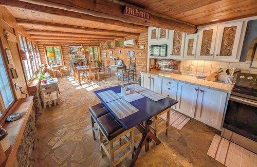This unique 100 year old log cabin sits next to the banks of the Chestatee River. Perfect for fishing, tubing or just sitting on the riverside platform having your morning cup of coffee of set at sundown with a glass of wine. Whatever your pleasure, we want you to relax and in this new time we live in, cleanliness is or number 1 priority. We sterilize everything and “ozonate every room after each stay to assure that there isn’t anything you wouldn’t want to take home with you left behind. 3 bedrooms and a master suite. 2 full baths. All stone and log construction. Large kitchen with a fireplace, large living room with a fireplace, game room, reading area and a solarium. All the rooms have a view of the Chestatee River. The cabin was previously owned by writer Hugh Wilson which wrote such great movies as "Police Academy", "First Wives Club", and the TV series "WKRP in Cincinnati" The Cabin is within minutes of some of the best wineries in the world and also just down the road from "The Dahlonega Square" with a bunch of great shops where you can shop til you drop or where you can pan for gold or visit the historic gold museum. Bet you didn’t know that Dahlonega was the 1st place GOLD was discovered in the United States. Come have a memorable stay. Now let me answer 2 of the most asked questions that we answer. The most popular question is 1: how much of the Lodge do we get?..answer All 4500 Sq Ft. No one lives in the Lodge while your there. 2: do you have cameras in the Lodge?…No, your privacy besides the cleanliness is most important.