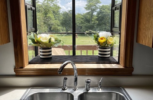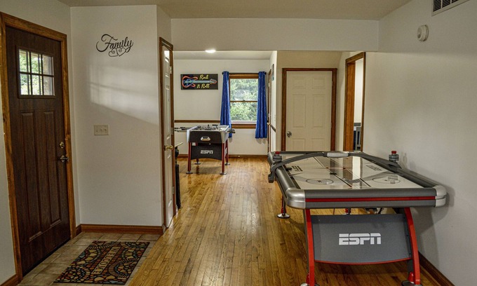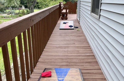 Bring the whole family to this great place with lots of room for fun. Inside the house you will find 4 spacious bedrooms, 2 bathrooms, 1 on each level, and a family fun living with a tv and sofa on one side of the room and family friendly games on the other side of the room. There’s also corn hole on the wrap around porch and a fire pit in the back deck.