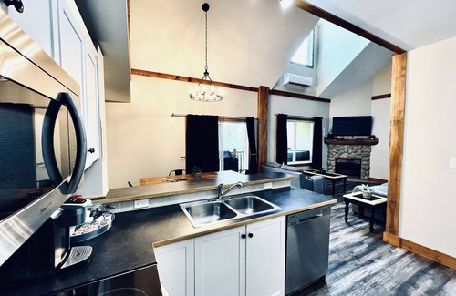 Unwind and Relax: Step inside and feel right at home with modern amenities like vinyl plank flooring, sleek appliances, a fully stocked kitchen and four TVs for your entertainment. After a day on the slopes, soak in the private hot tub on the deck or snuggle up by the stone fireplace. Full in-suite laundry ensures you have everything you need for a comfortable stay.