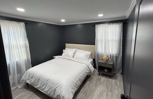 Escape to our Lake Haven, nestled in the peaceful countryside. This beautiful 2 bdrm features plush beds, & a pull-out couch. Enjoy a fully equipped kitchen, beautiful furniture, full Bar on main floor for entertaining, & lake access for swimming, boating, & fishing. With high-speed Wi-Fi, air conditioning, heating, & a flat-screen TV. This home sleeps 7 guests & is the perfect retreat for families, couples, or groups of friends. Book your stay now & experience the beauty of nature!