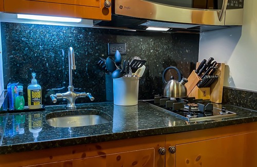 Kitchenette with; mini-fridge, two burner gas stove, dishwasher, Keurig coffee machine, all essentials to cook light meals