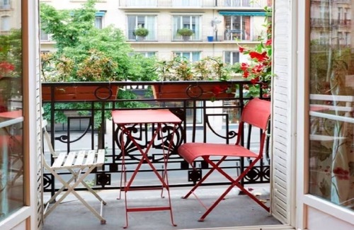 This left bank Parisian apartment is 120 square meters in size. It offers a spacious living room with a comfortable couch, arm chairs and also a desk and chair to work from. The apartment's balcony can be accessed from here and the table beside the balcony's entrance gives you the perfect spot to enjoy a glass of wine or a cup of coffee in the morning.