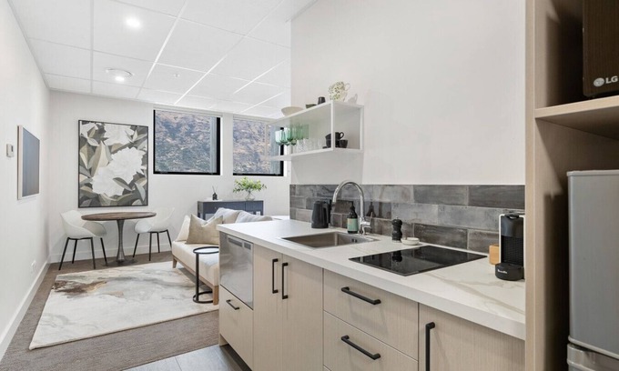Your suite has a dining space, cosy lounge seating, Samsung Frame TV, a well-equipped kitchen and ensuite bathroom.