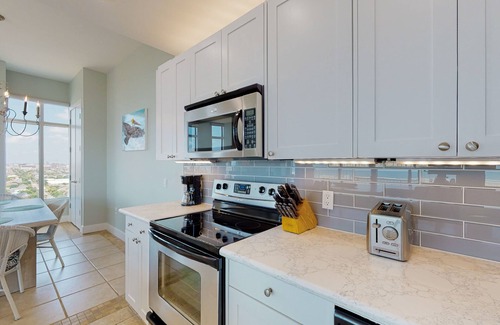 The main living area enjoys wall-to-wall windows with fantastic views of the beach and an open floor plan that will make you feel at home. Spread out comfortably in the inviting living area, furnished with comfy chairs, a sofa, and a TV with cable to keep you entertained during your stay. There is a balcony off the living room, offering a great spot to admire the views. Show off your culinary skills in the well-appointed kitchen and prepare exquisite homemade meals and treats for your family and friends.