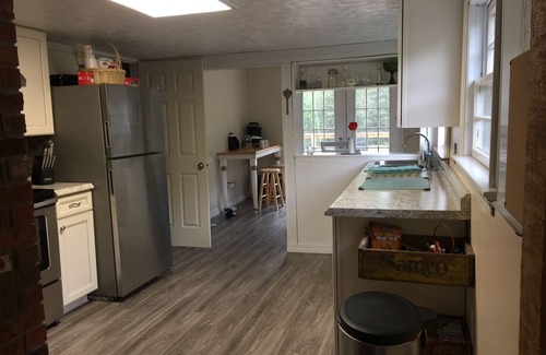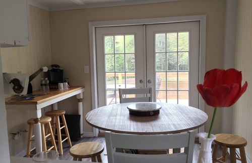 Enjoy your meals sitting on the deck overlooking the pond & Woods. Sit in the kitchen knook to enjoy the same view through the French doors.