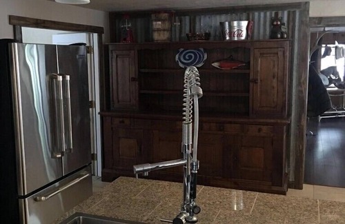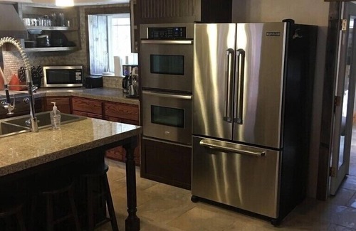 The cabin is a great mix of modern and rustic. The cabin consists of the original log cabin with new additions. The cabin has been completely restored/renovated all the way down to a new well, plumbing and wiring. The blend is made possible by re-purposing many of the original cabin materials with state of the art modern appliances. The kitchen is spacious and features chef's grade appliances to include a new 48" 6 burner and griddle stainless steel Jenn-Air cooktop with stainless steel backsplash, a pot filler and commercial stainless steel Jenn-Air range hood, 30" stainless steel double convection ovens, a stainless steel Jenn-Air refrigerator, a stainless steel dishwasher, and a 36" stainless steel apron front farm sink with commercial grade faucet. The kitchen and two adjoining additions have 18" X 18" imported Italian tile installed throughout, while the original cabin has all new laminate wood flooring. The cabin includes a laundry room with a flash hot water heater and brand new LG front load washer and dryer. The family room includes a 55" flat screen TV and a wood pellet stove. We provide DirecTV, internet wifi and a landline phone.