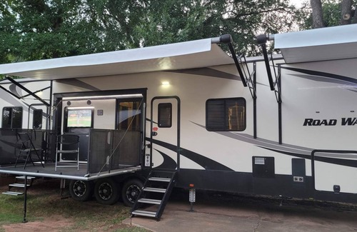 This RV features a full-size refrigerator, Private RV deck with TV, 4 TVs in this unit, 3 full size queen beds, not a table or couch conversion but real beds, 2 bedrooms and 1 and half baths. We provide Nespresso Coffee, filtered water and an Ice machine. BBQ grill available upon request. Bath products are also provided as well as light snacks.