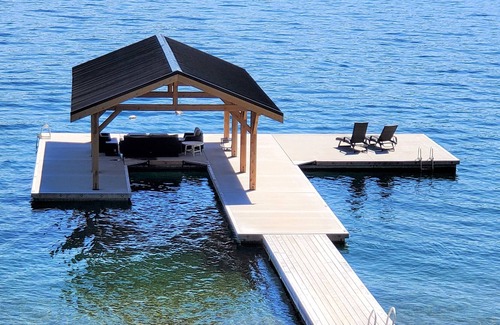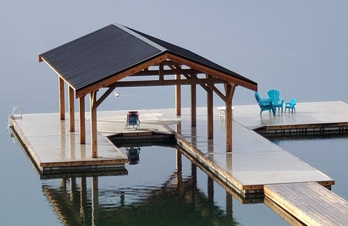 We have a brand new concrete dock with a generous boat slip and large boathouse with lots of shaded comfy seating. There are two dock ladders and a stainless staircase will be installed later this summer for easy entry and exit from the water.