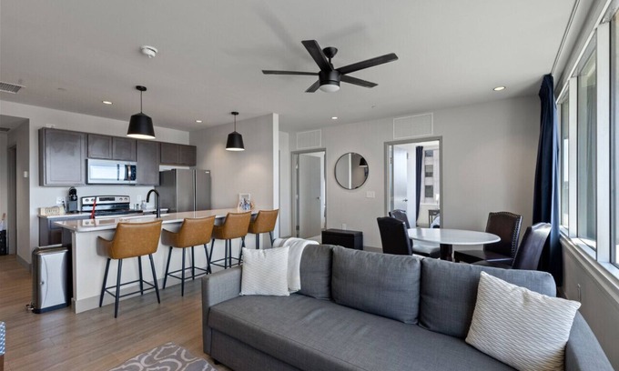 Residing on the 5th floor, this condo-hotel features two bedrooms, with queen-sized beds, living room with sleeper sofa, full kitchen w/ quartz and private washer/dryer. Guests can also walk to Rupp Arena, local restaurants like Carson's, coffee shops, retail & more!