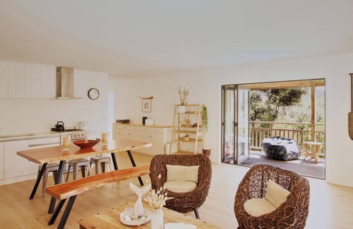 The Tree House is one of three private off-grid, solar-powered retreats on the property (Tree House, Pītokuku, and Ruru), all connected by scenic bush trails and just a five-minute walk to Medlands Beach.
