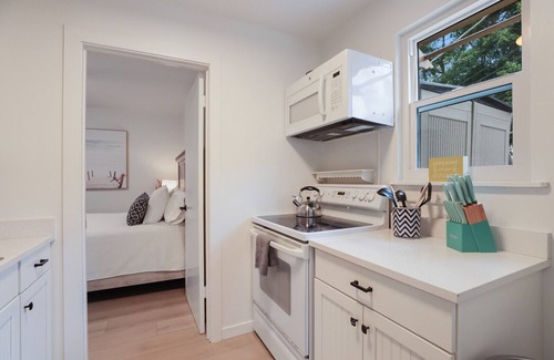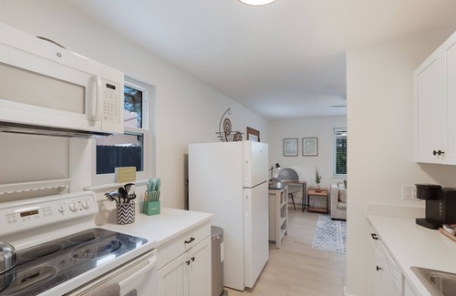 The main living space is an open style layout and an abundance of natural sunlight. The galley kitchen overlooks the great room. Relax in comfort with a cushy sofa in the living area. Through the kitchen is the Queen suite with an en suite bathroom featuring a small shower. This cottage was recently remodeled and comes completely furnished (including a fully stocked kitchen)with refrigerator, microwave, range. Really cute private patio for morning coffee or a glass of wine at night! Off street parking included.