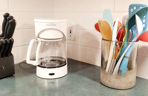 Stretch your legs out on the Queen sized bed (new in 2016) or the futon. I provide a 40' flat screen Smart TV with the standard You Tube TV, Netflix, Prime, Pandora, and so much more. Dining is at the bar in the kitchen. My kitchen is fully equipped with dishwasher, garbage disposal, stove top, oven, microwave and refrigerator with freezer. It is also stocked with dishes and coffee cups that are a service for 8. Wine glasses, silverware, towels, pot holders, paper towels, cooking utensils, knives, toaster, blender, crock pot and Gotham Steele pots and pans. The coffee machine is auto drip coffee maker takes round filters. It is a standard 8 cup auto drip coffee maker and again takes round paper filters.