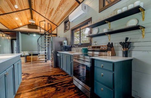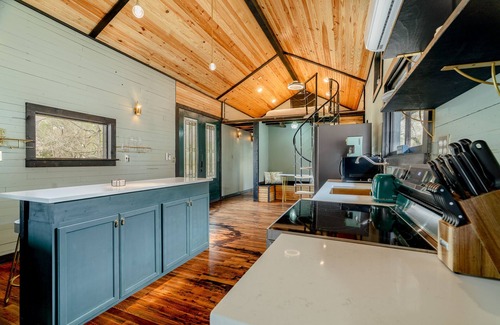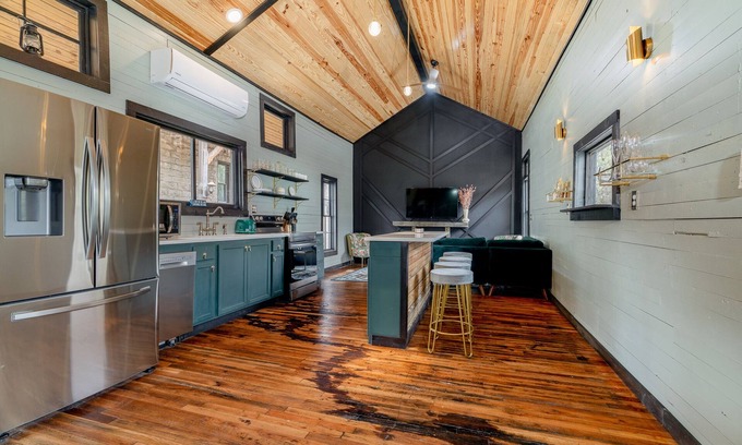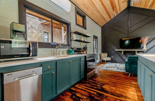 Eureka Springs one of a kind 1870 all-wood train depot on Table Rock Lake has luxurious art deco style everywhere. Complete inside/out remodel and design in 2023. Huge master bedroom with king-size bed. 2nd bed is a gorgeous large loft with a huge king size bed. Lots of room for more on the sectional couch and queen-size air mattress. Next to the Little Golden Gate Bridge! A short gorgeous 6-mile/14-minute drive from downtown Eureka Springs and Passion Play. Relax in style. Ask us to rent the pontoon boat!