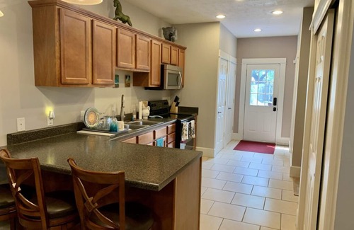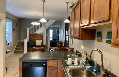 The home is 2 bedrooms/1.5 baths with a fully equipped kitchen, laundry room, dining room, library, living room and smart TV. There is a lovely fenced in back yard to gather around or relax in a hammock.