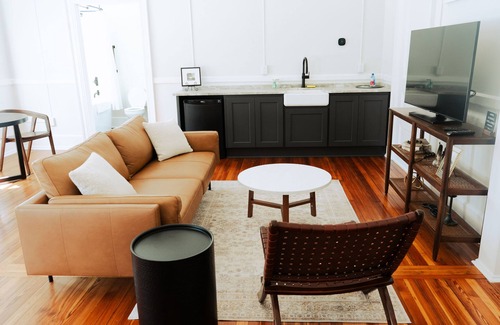 1906 at The McKey is one of our suites, which includes a bedroom, seating area with kitchenette, and a bathroom. Located on the third floor and named to honor the year our beautiful building was built by T.S. McKey and W.H. McKey in Historic Downtown Valdosta. The 1906 room includes a bathroom with a standing tub and shower. Also, included is access to a coffee maker and microwave. It is above Gud coffee shop and walking distance to many great restaurants and things to do.