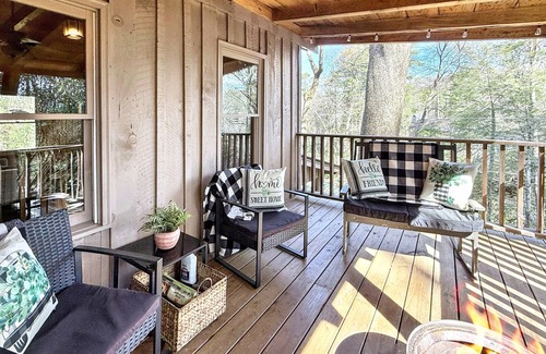 Experience a tiny little glimpse into the past in this cozy restored cabin, 1.3 miles from downtown Highlands ,built before the days of huge, looming, extravagance. 640 square feet with bunk bed room and living room and bath on main floor, and kitchen and master with en-suite bath downstairs. An accurate representation of the time period, this home features gorgeous original hard wood flooring, and two perfect porch's for relaxing while listening to the native owls and birds. Outfitted with modern conveniences like great wifi (490 Mbps) Fire stick tv and beautiful furnishings you will have everything needed without all the headache. The downstairs porch is ready for a late evening meal with our charcoal grill or upstairs to just sit back & listen to sounds of the wildlife while enjoying a fire in the new smokeless wood burning fire-pit. A perfect nook for relaxation with a cottage feel. During the winter enjoy the deep woods with the winter view. If you are here during the snow, hear the silence... the sparkling and occasional bird track in the crispness of snow. Privacy, with private driveway and parking. While we welcome all ages, please be diligently cautious with children under 5 due to varying levels on the property and stairs and step down in the home.